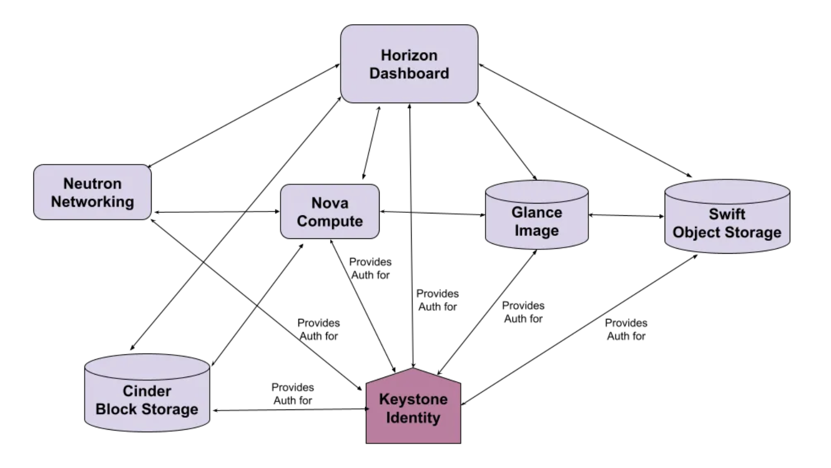 모든 OpenStack 서비스(Nova, Glance, Cinder 등)는 Keystone을 통해 사용자 인증을 수행하며, 사용자의 권한(Role) 및 프로젝트(Project)에 대한 접근 권한을 관리한다.