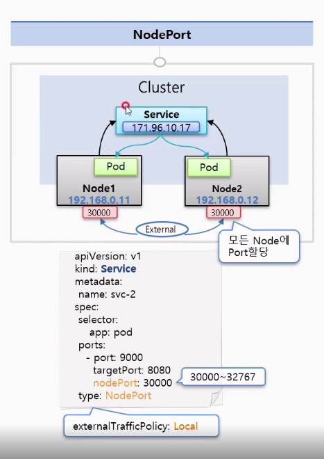 내부 시스템 간 통신이나 디버깅에 적합하다. - NodePort: 외부에서 접근 가능하도록 모든 노드의 고정 포트를 열어주는 타입.