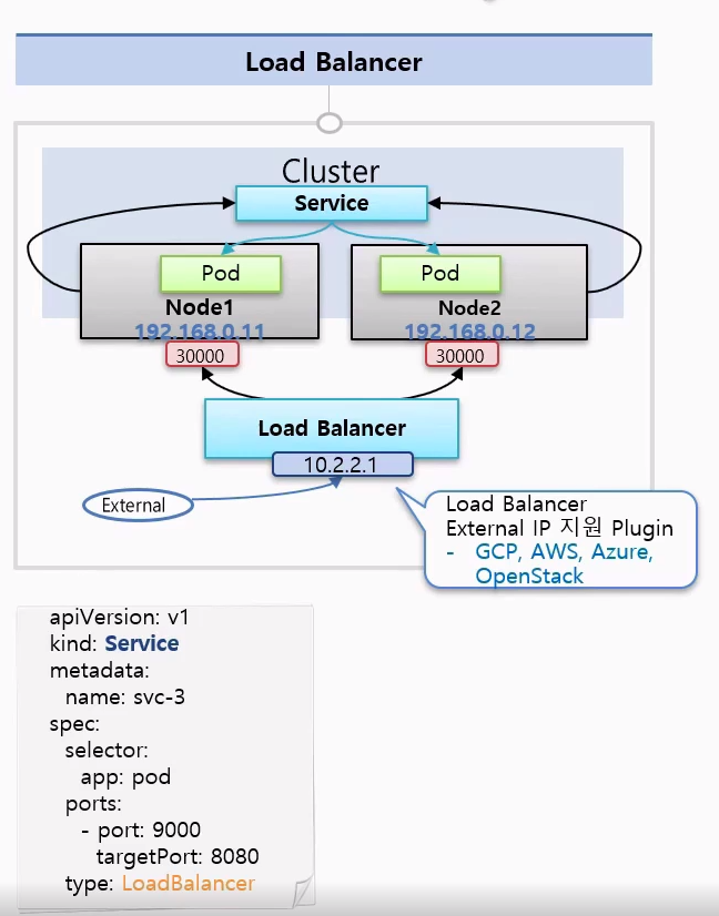 Load Balancer 타입의 Service는 NodePort와 동일한 특성을 가지고 있다. 추가적으로 LoadBalancer라는 걸 이용해서 각각의 Node에 Traffic을 분산시켜주는 역할을 한다.