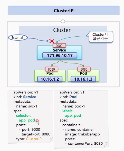 이 IP는 Cluster 내에서만 접근이 가능하다. Pod가 가지고 있는 IP와 동일하게 외부에서는 접근이 불가하다.