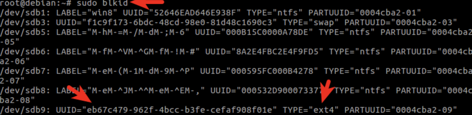 /dev/sdb1: UUID="1234-5678-ABCD-EFGH" TYPE="ext4"