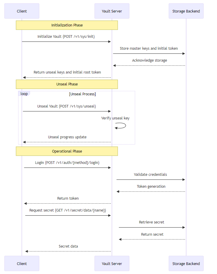 Vault 서버는 초기화 시 마스터 키와 초기 토큰을 스토리지 백엔드에 저장한다. 이는 잠금 해제 프로세스와 Vault에 대한 초기 액세스에 중요하다.