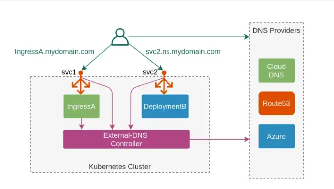 K8S 서비스/인그레스 생성 시 도메인을 설정하면, AWS(Route 53), Azure(DNS), GCP(Cloud DNS) 에 A 레코드(TXT 레코드)로 자동 생성/삭제된다.