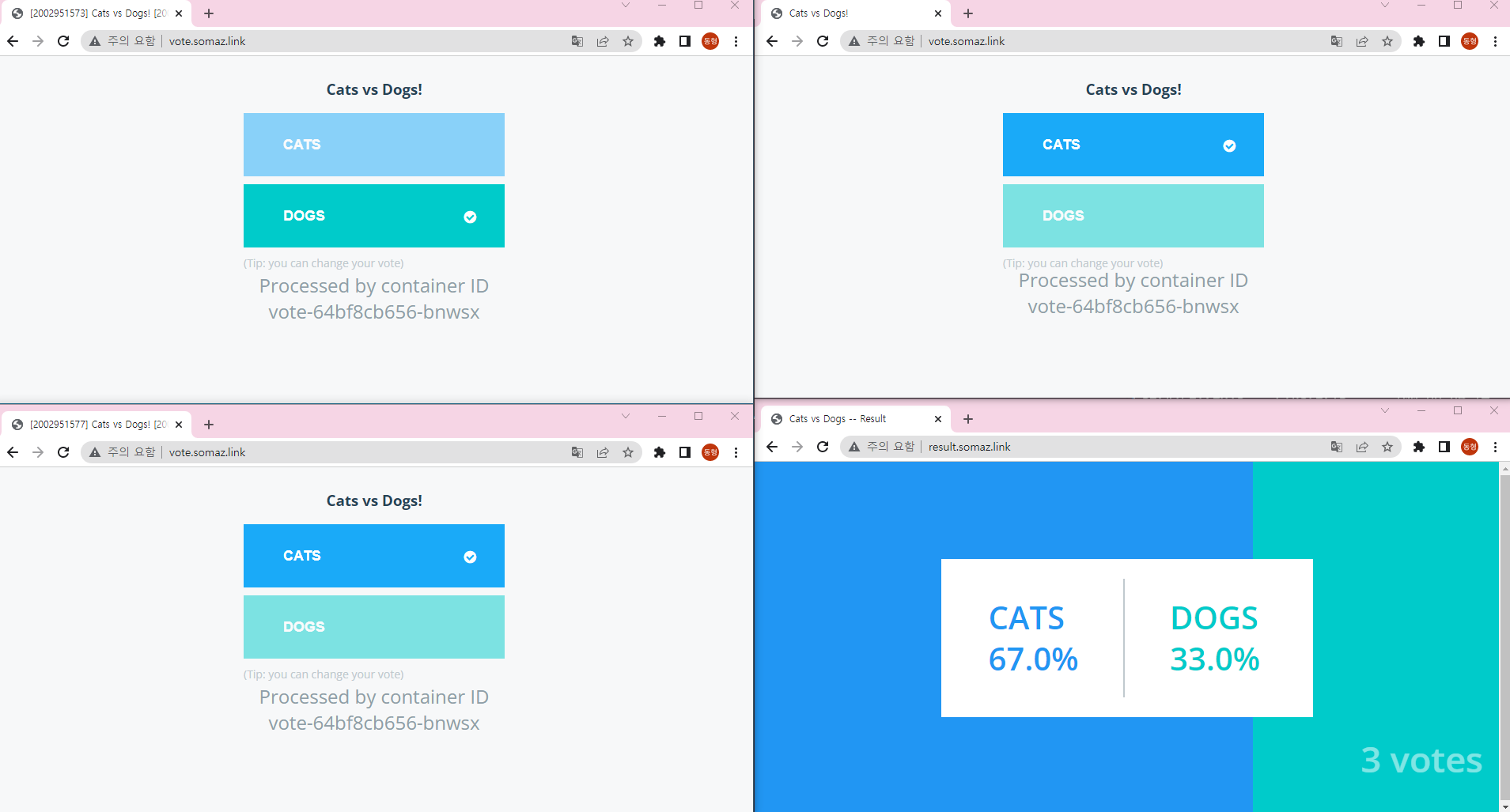 - vote.somaz.link, result.somaz.link 도메인으로 외부 접속 확인