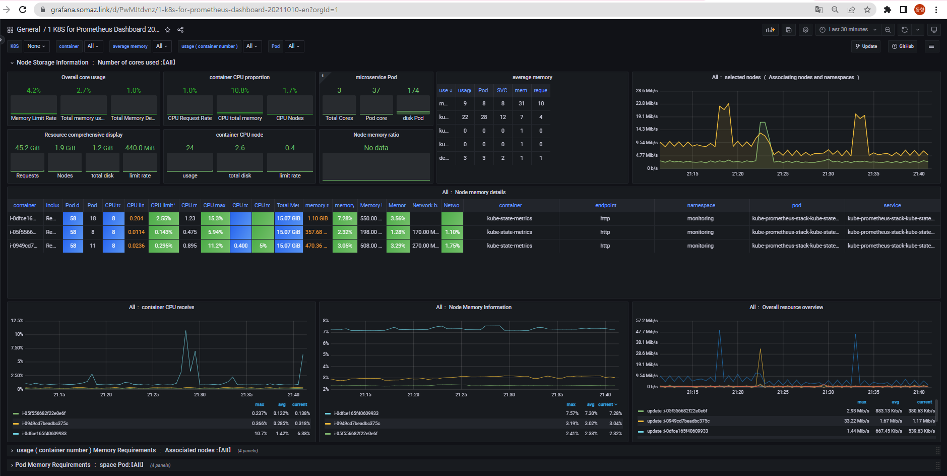 - Grafana 설치 및 여러 공식 대시보드 추가 (13332, 1860, 3662, 15661)