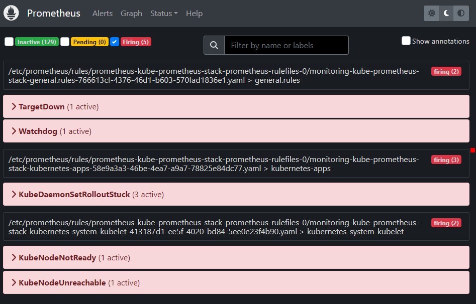 Awesome Prometheus alerts 를 참고해서 스터디에서 배우지 않은 Alert Rule 생성 및 적용 후 관련 스샷 올리기