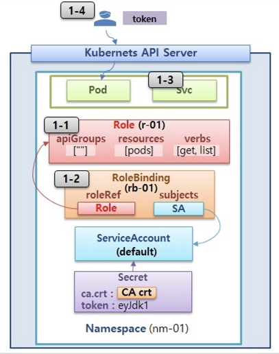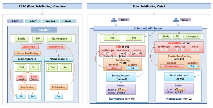 - 롤(Role) : apiGroups 와 resources 로 지정된 리소스에 대해 verbs 권한을 인가
