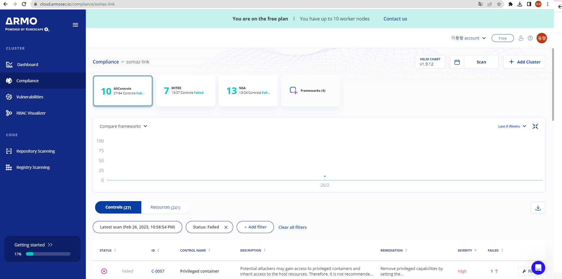 kubescape armo 웹 사용 후 관련 스샷을 올려주세요