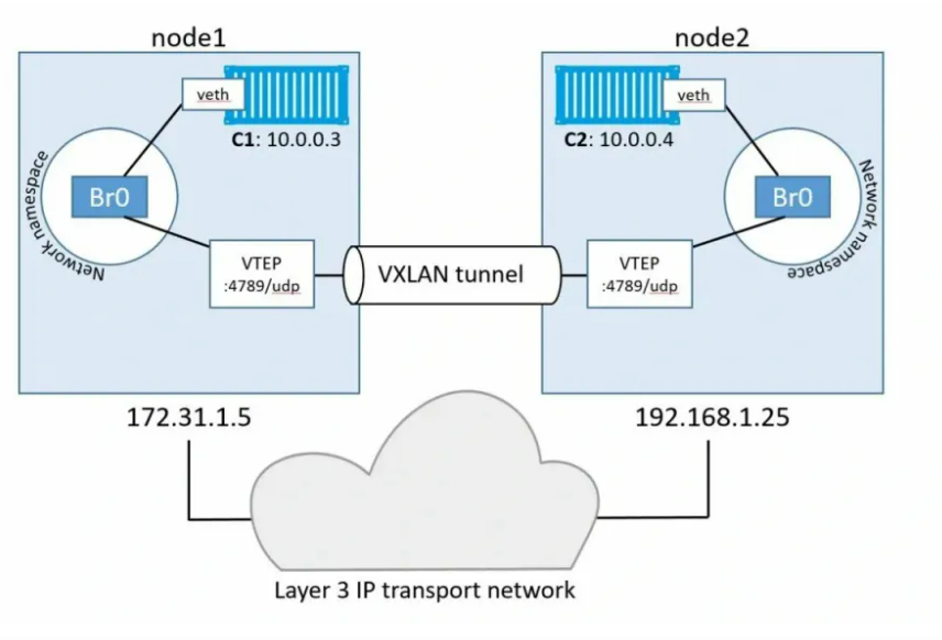 그리고 VXLAN은 오버레이 네트워크의 하나의 예시이다. 가상화된 환경에서 서로 다른 서브넷(subnet)을 가지고 있는 가상 머신(VM)들이 통신할 수 있도록 하는 가상화 네트워크 프로토콜이다. 물리적인 네트워크 상에서 서로 다른 가상 네트워크를 구성할 수 있도록 하며, 물리적인 네트워크 상에서는 하나의 네트워크로 동작한다.