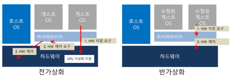 - 반가상화를 사용하려면 가상머신 운영 체제가 수정되어야 한다.
