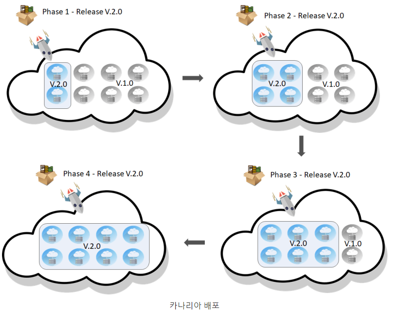 아래의 이미지는 애플리케이션이 버전 V1.0이고 새 릴리스 또는 배포가 V2.0을 배포한다고 가정한다. 이 배포는 4단계로 이루어진다. 1단계에서 릴리스는 클러스터에 있는 노드의 25%에서 발생하며 사용자 집합에 의해 테스트된다. 그런 다음 2단계에서는 노드의 50%가 V2.0을, 3단계에서는 75%가, 마지막으로 4단계에서는 노드의 100%가 새 버전을 받게 된다.