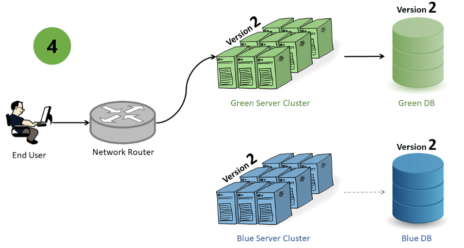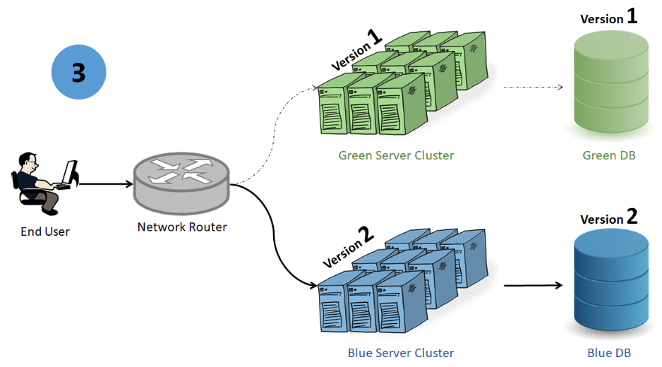 배포 후 새 버전이 유휴 환경에서 올바르게 작동하는지 확인하기 위해 테스트가 수행된다. 새 버전이 확인되면 트래픽이 활성(Blue) 환경에서 유휴(Green) 환경으로 점진적으로 전환된다.