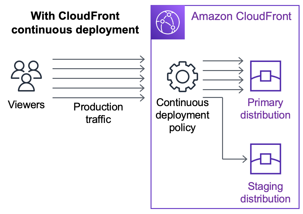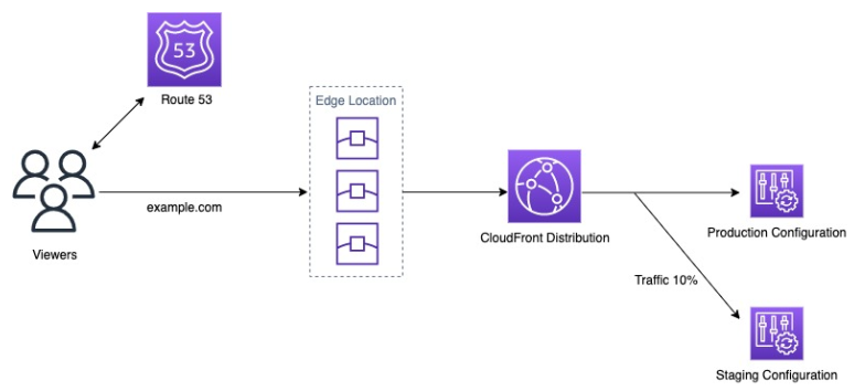 Cloudfront의 지속적 배포를 사용하면, Staging 서버에 먼저 테스트하여 변경 사항을 Primary 서버에 안전하게 배포할 수 있다. 그래서 새로운 CDN 구성으로 일부 트래픽을 보내고 예상한 대로 잘 작동하는지 확인할 수 있다.