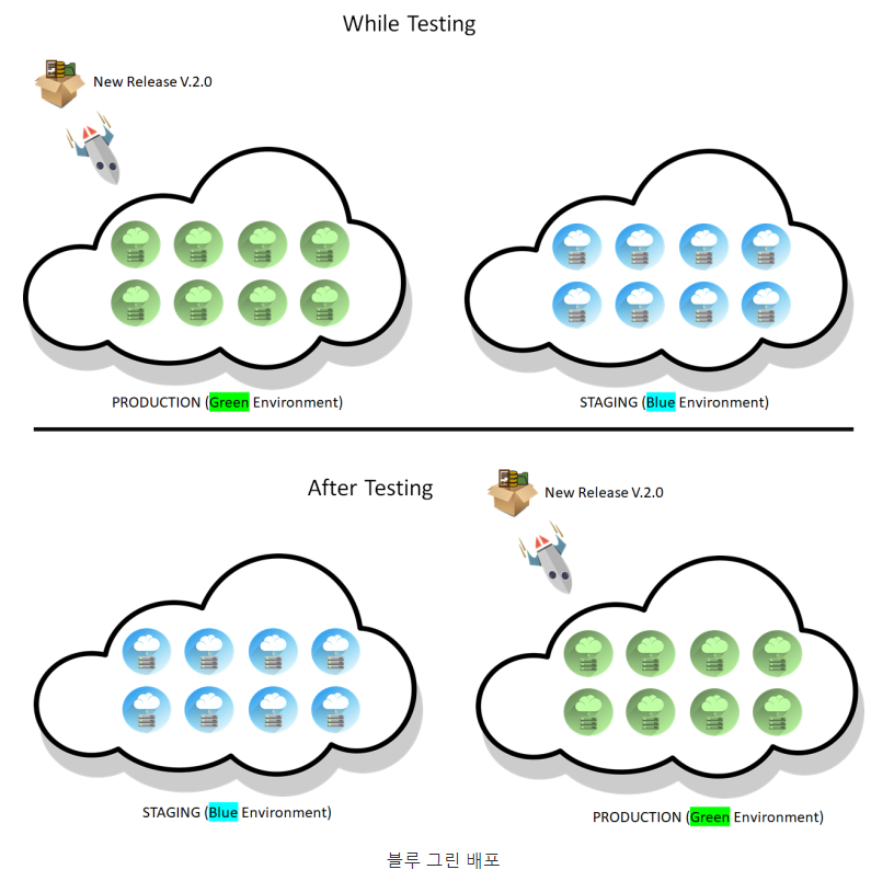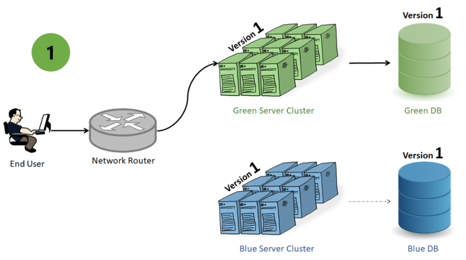 즉, 우리는 두 개의 동일한 프로덕션 환경이 필요하다. 하나는 Blue 또는 스테이징 환경이고 다른 하나는 Green 또는 Production 환경이며 그 중 하나는 한 번에 최종 사용자에게 서비스를 제공한다.