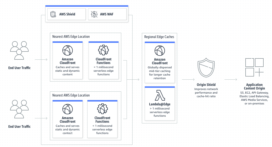 CloudFront는 엣지 로케이션에서 콘텐츠를 캐싱하여 오리진 서버의 부하를 줄이고 사용자의 지연 시간을 줄인다. 또한 캐시 동작 및 캐시 제어 헤더를 구성하여 다양한 콘텐츠 유형에 대한 캐싱 정책을 미세 조정할 수 있다.