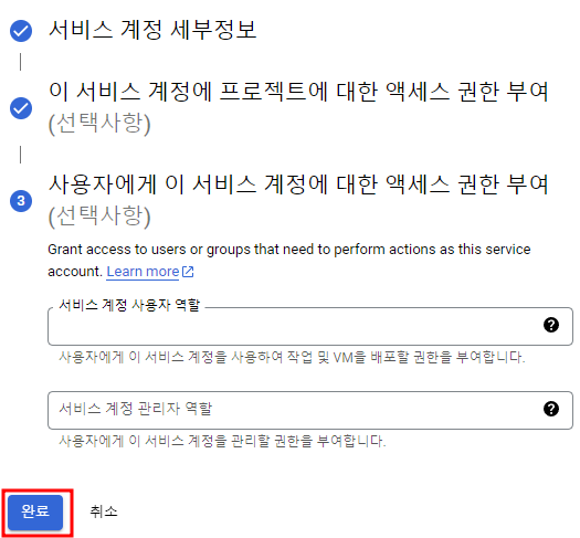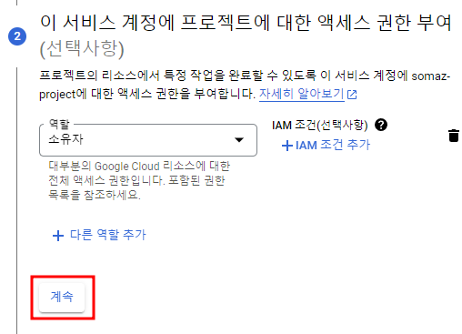 서비스 계정 액세스 권한은 부여하지 않는다. 그 이유는 위의 권한 설명으로 대체되었을 것으로 보인다.