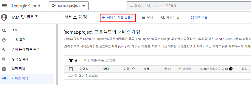 그리고 해당 페이지에서 [서비스 계정 만들기]를 클릭한다.