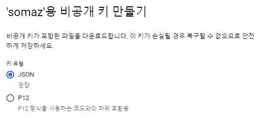 [키 추가] 클릭 후 [새 키 만들기]로 들어와 키 유형은 JSON을 선택해 준다.