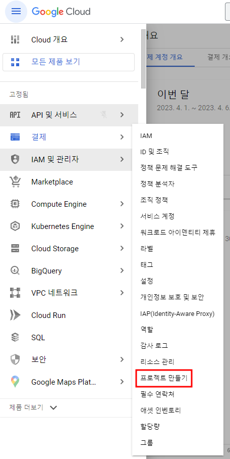 프로젝트 선택 후 IAM 및 관리자에서 서비스 계정으로 들어가준다.