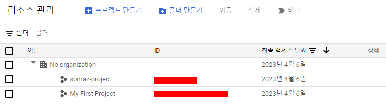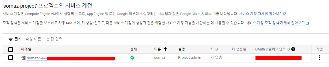 만들고 난 후 `IAM - 리소스 관리` 로 들어가보면 아래와 같이 생성되어있다.