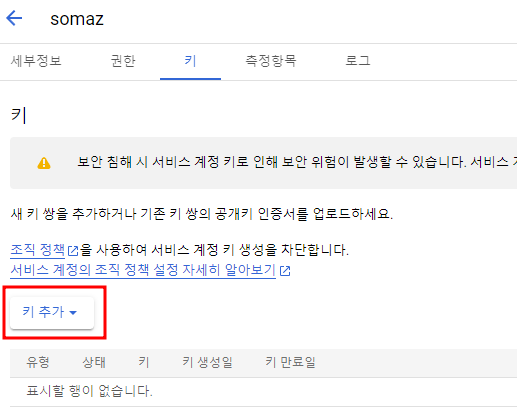 계정 선택 후 키 항목에 들어온 후 [키 추가]를 클릭해준다.