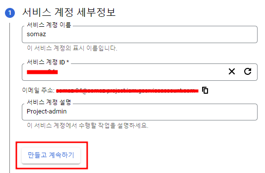 자신이 원하는 서비스 계정 ID를 입력 후 [만들고 게속하기]를 클릭해준다.