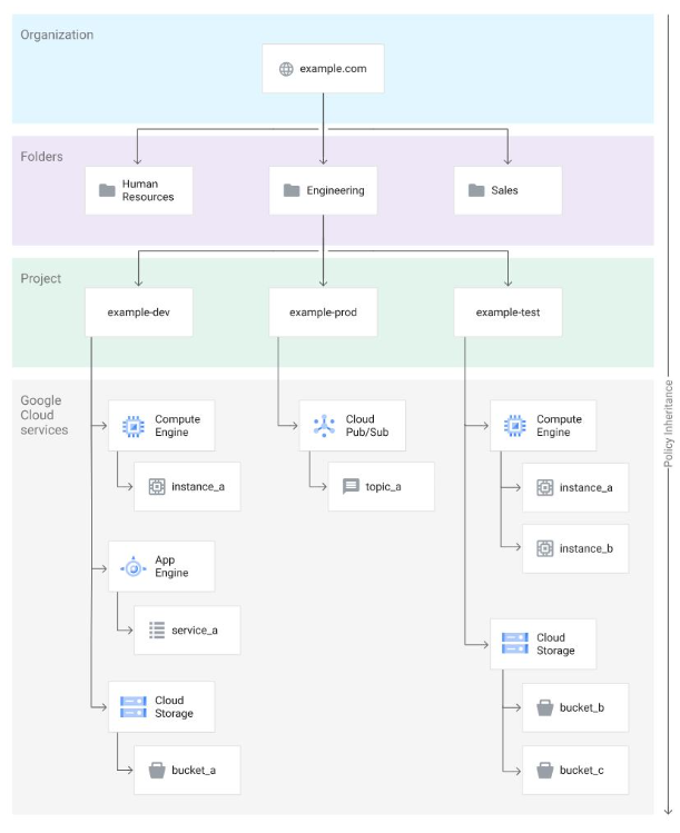 폴더는 프로젝트 및 기타 폴더를 그룹화하는 데 사용되며 추가 수준의 구성을 제공한다. 폴더는 중첩될 수 있으며 상위 폴더 또는 조직에서 정책 및 권한을 상속받을 수 있다.