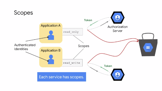 각 서비스에는 인증된 ID가 작업에 대한 권한이 있는지 확인하는 데 사용되는 범위가 있다.