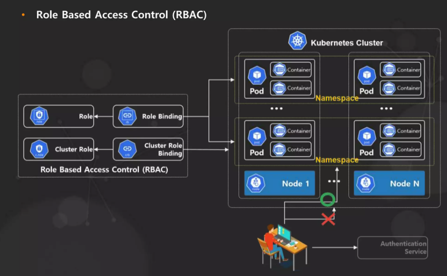 - 쿠버네티스는 Role-Based Access Control(RBAC) 및 Attribute-Based Access Control(ABAC) 등 다양한 권한 부여 방식을 지원한다.
