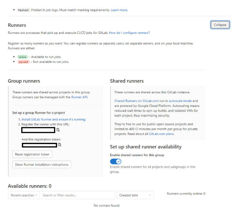 CI/CD 메뉴에서 Runners로 접근하면 Group runners에 등록할 URl과 토큰 정보가 보인다.