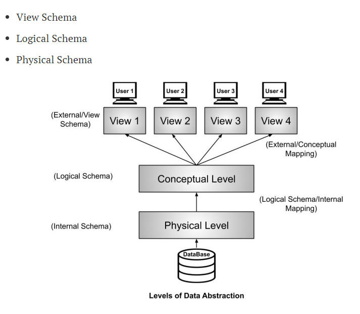 반면, 3개 스키마 아키텍처(외부, 개념 및 내부 스키마)는 데이터의 논리적 구성을 물리적 스토리지 및 사용자 상호 작용으로부터 분리하기 위한 프레임워크를 제공한다.