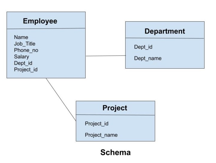해당 스키마 다이어그램에서 `Employee` 와 `Department` 는 관련되어 있고 `Employee` 와 `Project` 테이블은 관련되어 있다.