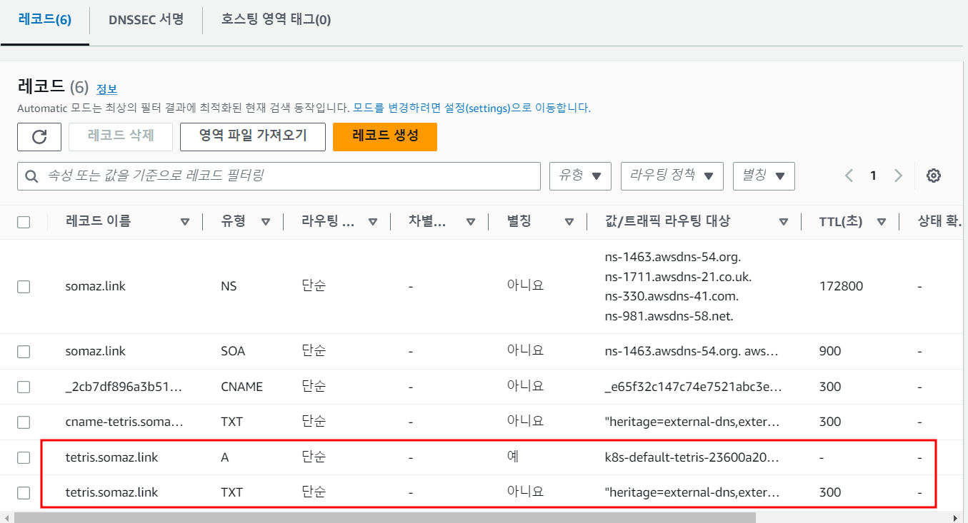 ingress.networking.k8s.io/tetris <none> tetris.somaz.link k8s-default-tetris-d74062c3c8-532279177.ap-northeast-2.elb.amazonaws.com 80 3m54s
