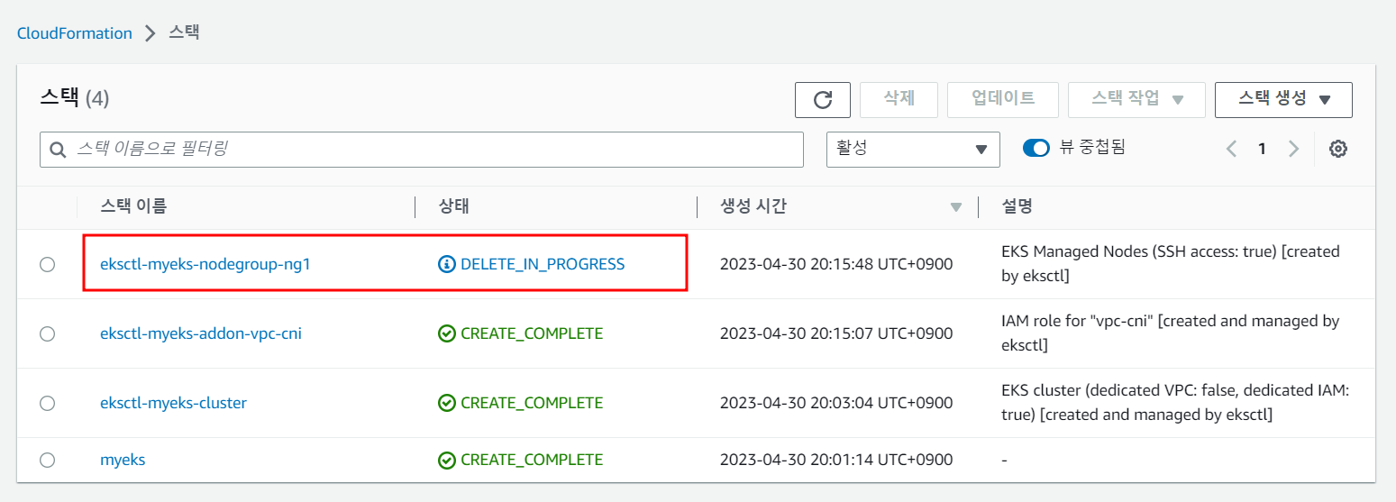 삭제 방안2 : 장점(eks 삭제 실행 후 SSH 세션이 중지되도 eks는 삭제 완료됨), 단점(eks 삭제 후 작업용 EC2 관련 CloudFormation 스택 삭제 필요)