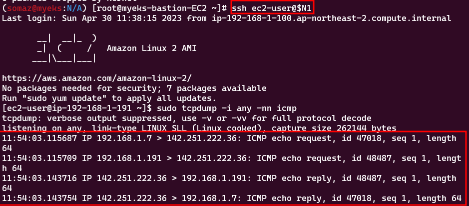 ssh -i ~/.ssh/somaz-key.pem ec2-user@$(aws cloudformation describe-stacks --stack-name myeks --query 'Stacks[*].Outputs[0].OutputValue' --output text)