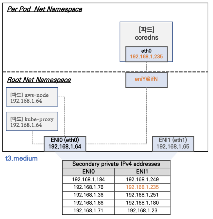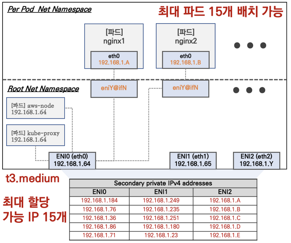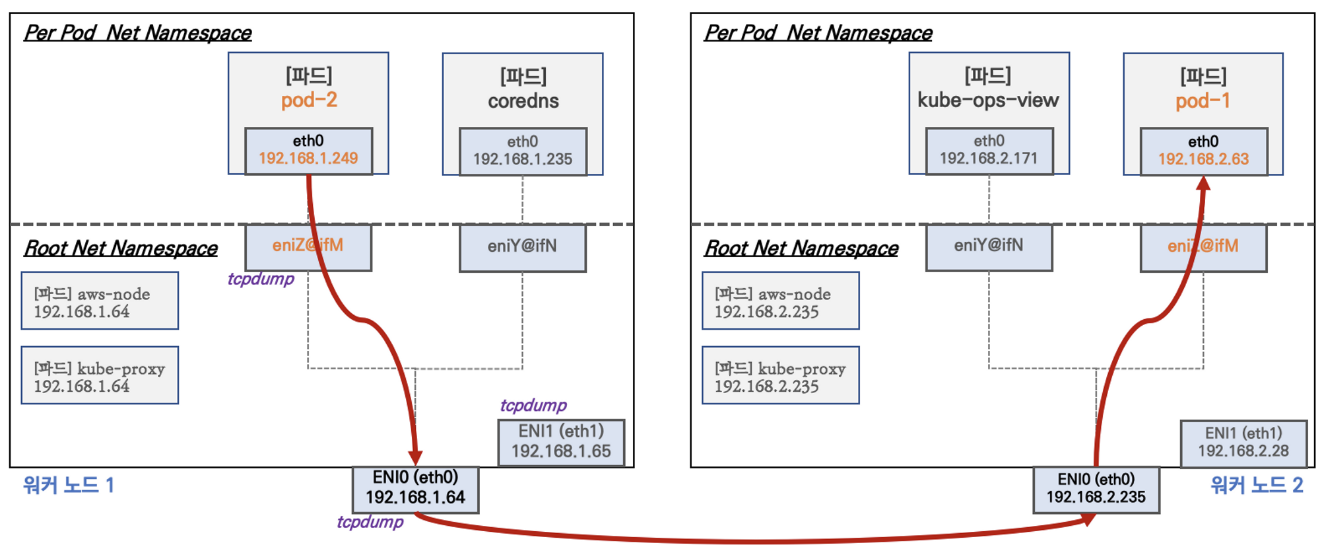 AWS VPC CNI는 파드의 IP를 할당해준다. 그리고 파드의 IP 네트워크 대역과 노드(워커)의 IP 대역이 같아서 직접 통신이 가능하다.