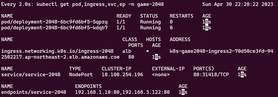 service/tetris LoadBalancer 10.100.154.43 k8s-default-tetris-3bb158f2f9-67ba9f6fb06d60d3.elb.ap-northeast-2.amazonaws.com 80:31437/TCP,443:31039/TCP 50s