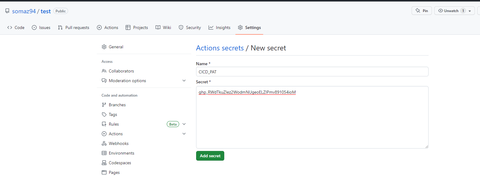 git push https://${{ secrets.CICD_PAT }}@github.com/${{ github.repository }} test1