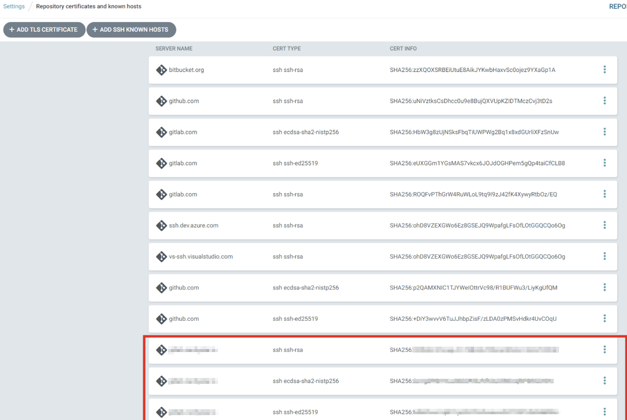 Settings - Repository certificates and known hosts를 보면 bitbucket.org와 github와 gitlab 그리고 azure등의 ssh key가 들어가 있다.