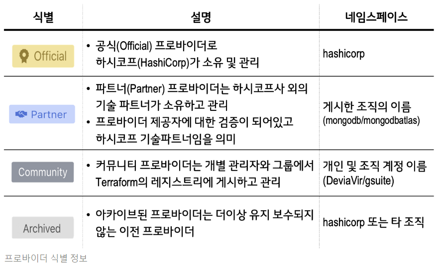 테라폼 레지스트리의 프로바이더에 유지 보수 및 게시에 대한 권한에 따라 Tier 정보가 제공된다.