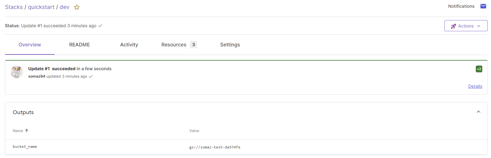 View in Browser (Ctrl+O): https://app.pulumi.com/somaz94/quickstart/dev/updates/1