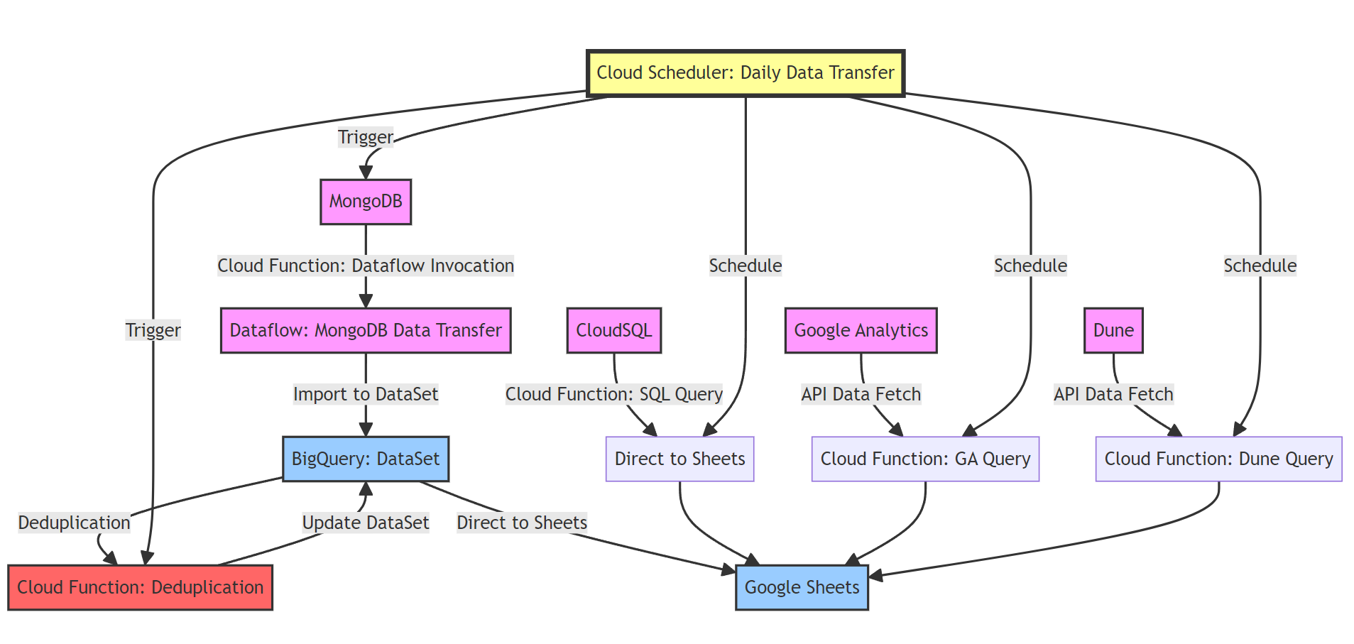 MongoDB, CloudSQL, GA, Dune 등 여러 소스로부터 데이터를 수집하고, 이를 BigQuery로 집계 및 정제한 후, Google Sheet로 결과를 전달하는 흐름은 실무에서 매우 활용도가 높은 아키텍처다.