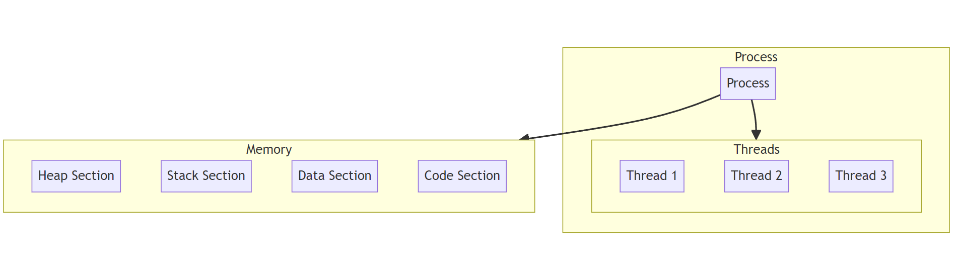 | Memory | 자체적인 별도의 메모리 공간(힙, 스택 등)이 있다. | 프로세스 내에서 메모리 공간을 공유한다(프로세스의 힙 및 전역 변수에 액세스할 수 있다). |