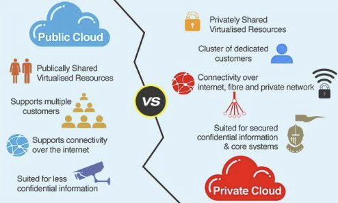 퍼블릭 클라우드와 프라이빗 클라우드 모두 클라우드 컴퓨팅 기능을 제공하지만 주요 차이점은 접근성과 테넌시에 있다.
