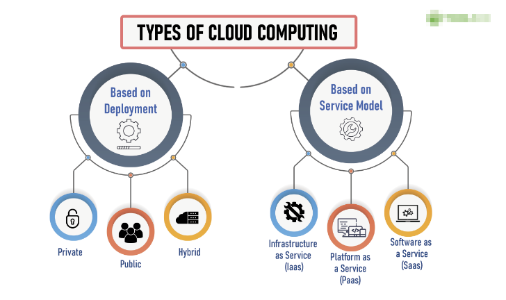 그리고 클라우드 컴퓨팅은 배포 모델이나 서비스 유형에 따라 분류될 수 있다. 특정 배포 모델을 기반으로 클라우드를 퍼블릭, 프라이빗, 하이브리드 클라우드로 분류할 수 있다. 동시에 클라우드 모델의 서비스에 따라 IaaS(Infrastructure-as-a-Service), PaaS(Platform-as-a-Service), SaaS(Software-as-a-Service)로 분류할 수 있다.