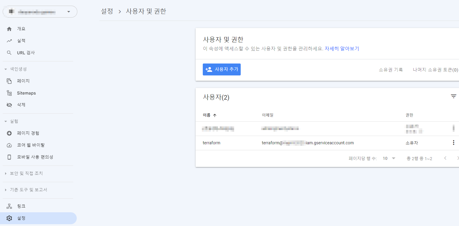 소유권 인증 후에 `설정 - 사용자 및 권한` 에서 테라폼에서 사용하고 있는 서비스 계정을 등록해준다.