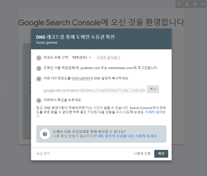 아래의 사이트에서 소유권 설정을 위한 TXT 레코드를 제공받을 수 있다.