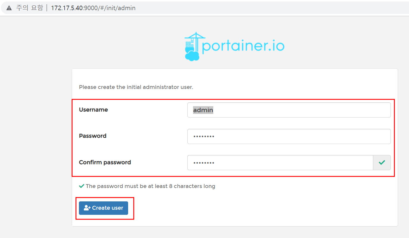 ✅ 이제 PC의 IP 주소 + 포트(9000)를 입력하여 웹 브라우저에서 Portainer에 접속할 수 있다.