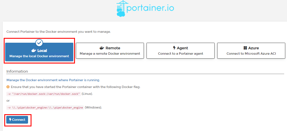- "Local" 선택 → "Connect" 클릭