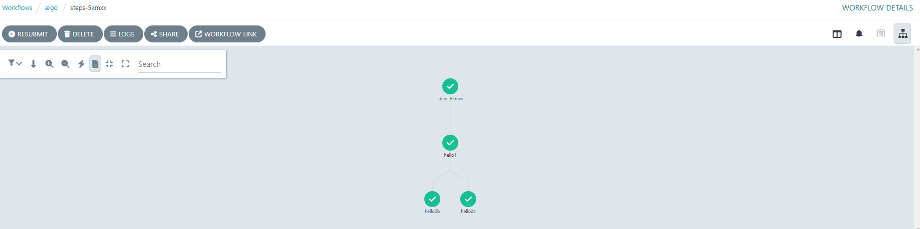 템플릿 `hello-hello-hello`은 3개로 구성 구성된다. `hello1`이라는 이름의 첫 번째 단계는 순차적으로 실행되고 `hello2a`와 `hello2b`라는 이름의 다음 두 단계는 서로 병렬적으로 실행된다.